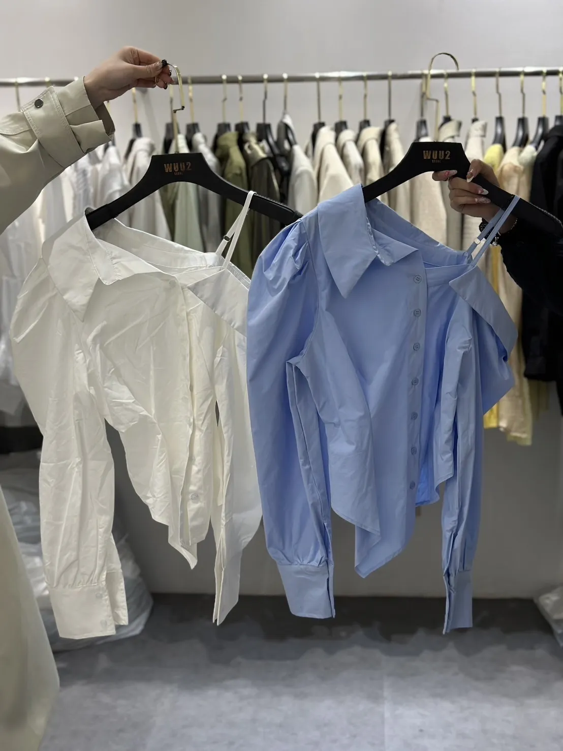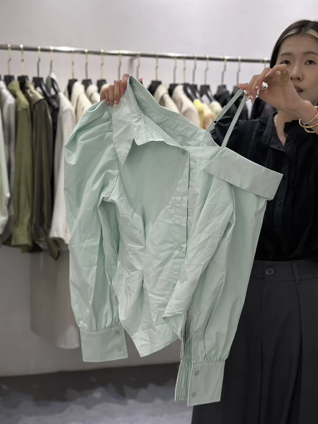 斜肩收腰襯衫