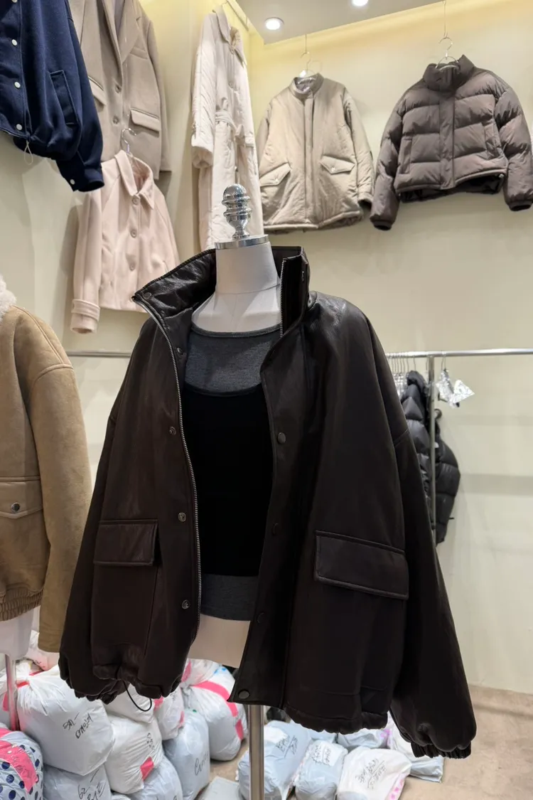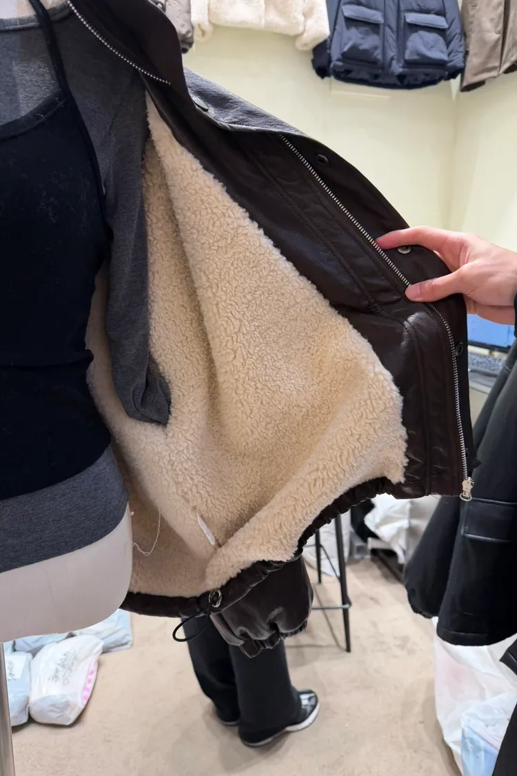 (內羊羔毛)長版拉鍊壓釦口袋皮夾克外套*2色