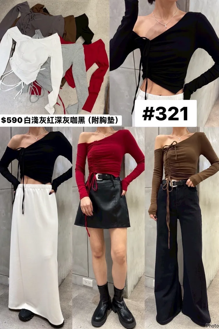 斜肩側抽長袖上衣(附胸墊)*6色(現貨:黑1)